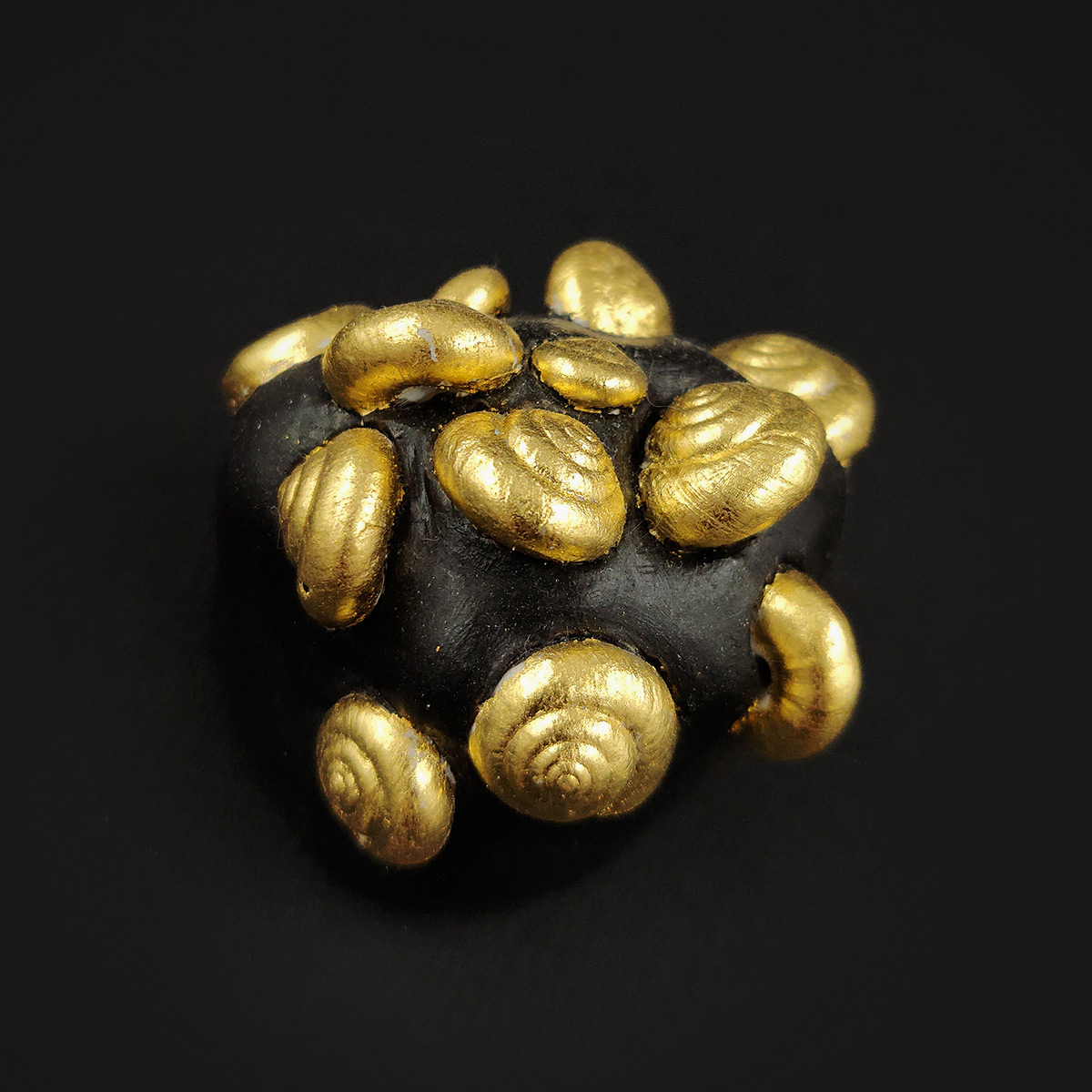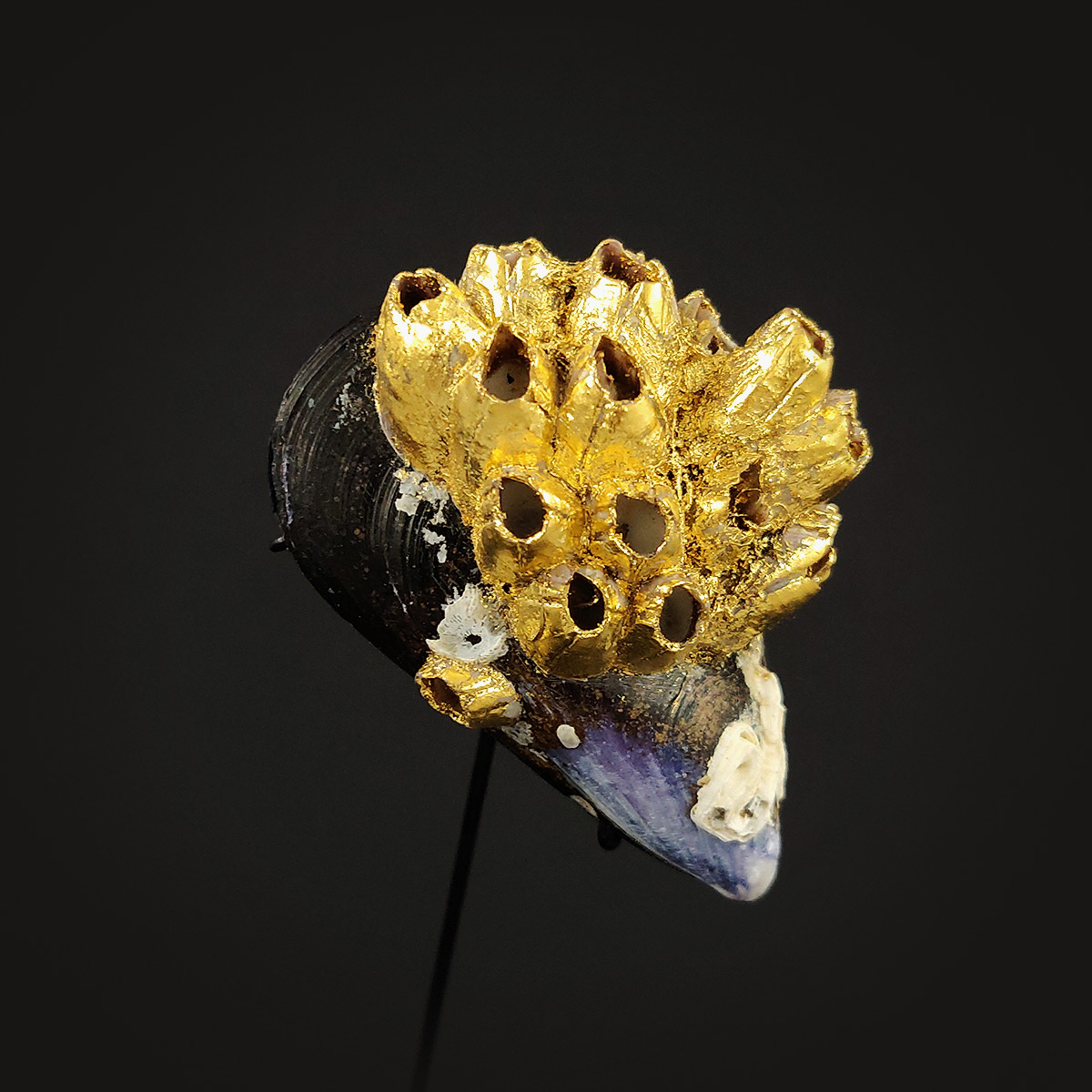 Au fil de ses balades, Odette est toujours en quête d’une pièce unique : coquillage, crabe ou étoile de mer. Des curiosités qui inspirent la pose de feuilles d’or. Une manière de célébrer la nature qui l'entoure.